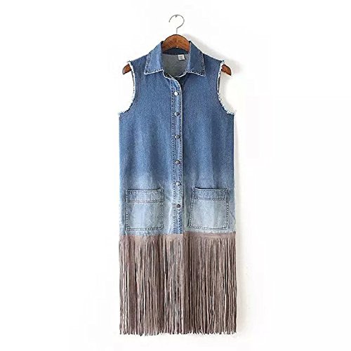 Women's Denim Lapel Tassel Blue Spliting Pocket Vest Jacket Coat (ASIAN L)