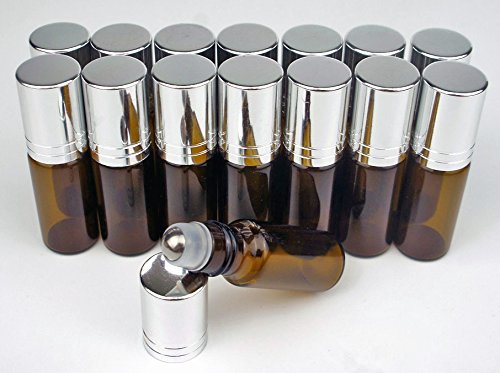 5ml Amber Glass Roller Bottles - Set of 15 with Metal Chrome Roller Ball Refillable Amber Roll-on for Aromatherapy,Fragrance Essential Oil,perfumes and Lip Balms