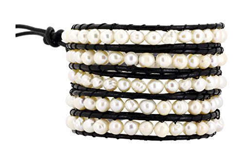 Mandala Crafts Womens Long Beaded Dyed Freshwater Cultured Pearl Wrap Around Leather Bracelet (White)