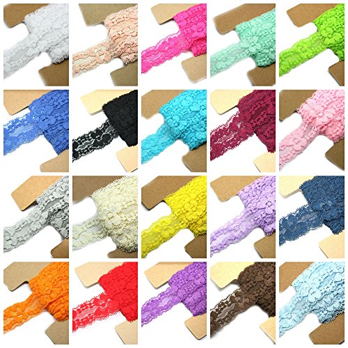 Lace Fabric JLIKA 20 Yards Stretch Elastic - 1" Wide - Soft Trim Lace for Headbands Garters Variety Pack Mix Colors Grab Bag As pictured - 20 Colors 1 Yard Each