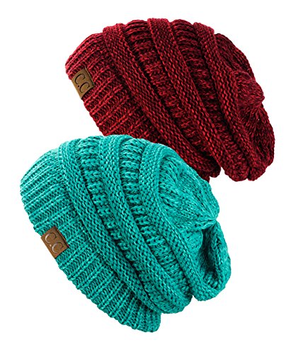 NYfashion101 Exclusive Unisex Two Tone Warm Cable Knit Thick Slouch Beanie Cap, 2 Pack - 2 Tone Burgundy & 2 Tone Mint