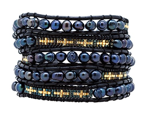 Mandala Crafts Womens Long Seed Bead Dyed Freshwater Cultured Pearl Wrap Around Leather Bracelet (Black & Gold Tone)