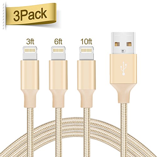 iPhone Charger Cable, Quntis 3Pack (3ft 6ft 10ft) Braided Charging and Syncing USB Lightning Charger Cord Certified for iPhone 7 7 Plus 6S 6 Plus 6S 6 SE 5S 5C 5 iPad Air Mini iPod Nano 7 (Gold)