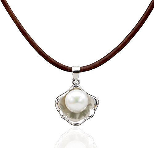Freshwater Cultured 9-10mm Pearl Sterling Silver Oyster Shell Pendant Necklace on Brown Leather Cord,16"
