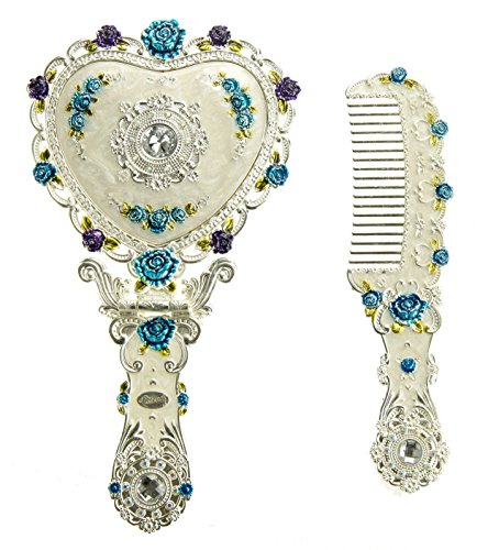 Ivenf Heart Shape Hand-Painted Royal Vintage Princess Metal Hand Mirror & Comb Set, Wedding / Anniversary / Christmas Gift, Silver Set