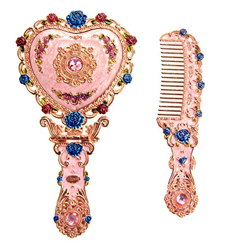 Ivenf Heart Shape Hand-Painted Royal Vintage Princess Metal Hand Mirror & Comb Set, Wedding/Anniversary, Pink Set