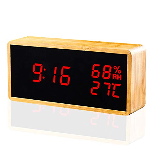 Alarm Clock, KABB Digital Clock, Natural Bamboo Material LED Desk Clock with Triple Alarms, Adjustable Brightness, Calendar Temperature Humidity Display and Voice Control Mirror Clock for Office Home