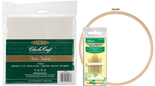 Embroidery Starter Kit! DMC Classic Reserve Aida, 12 By 18-inch, White, 14 Count. Along with a Pack of 16 Gold Eye Embroidery Needles (Clover, No. 3-9) with a 10 Inch Wood Embroidery Hoop