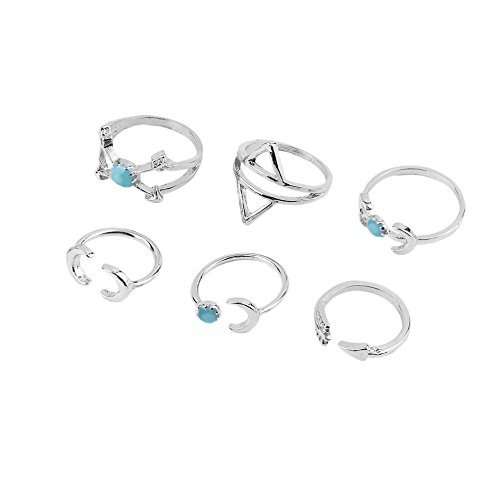 BeOne®6PCS Fashion Vintage Turkish Arrow Moon Turquoise Joint Knuckle Nail Midi Ring Set (Silver)