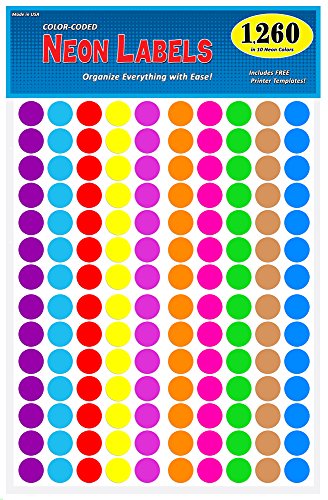 Pack of 1260 3/4" Round Color Coding Circle Dot Labels, 10 Bright Neon Colors, 8 1/2" x 11" Sheet, Fits Any Printer