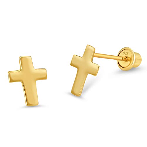 14k Gold Plated Brass Plain Cross Screwback Baby Girls Earrings with Sterling Silver Post