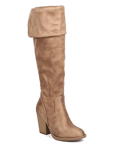 Women Suede Fold Over Knee High Chunky Heel Riding Boot DC78 - Taupe