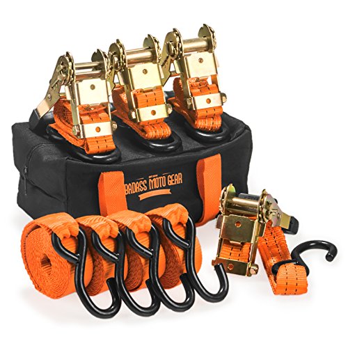 Badass Moto Gear 15' 3300 Lb Heavy Duty Ratchet Straps 4 Pk. 1100 Lb Load - 180º S Hooks Padded Ratchet Strap Set - 4 Tie Down Straps - Motorcycle, Cargo, Trailer, Truck - EZ Grip Smart Handle