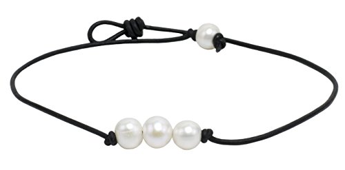 High Quality 3 Freshwater Cultured 9.5-10.5mm Pearl Necklace on Black Leather Cord, 16"