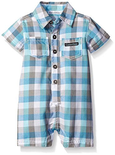 Calvin Klein Baby Boys' Woven Plaid Poplin Romper, Blue, 18 Months