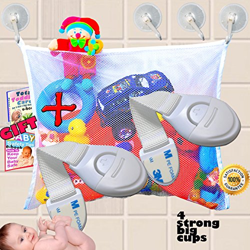 Bath Toy Organizer +2 Safety Locks Free + 2 Strong Hooked Suction Cups bonus. Mesh Heavy Duty Pocket for Tiidy Bath, Car or Baby Stroller Storage Basket.
