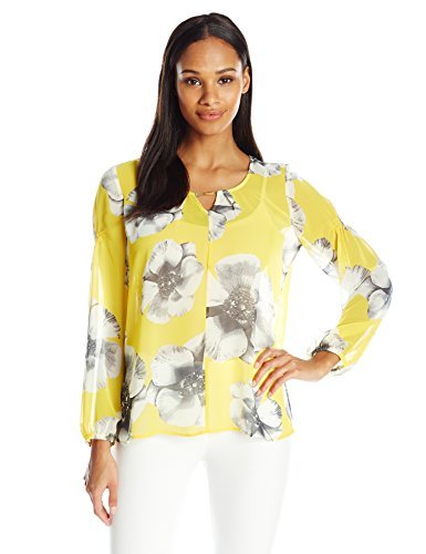 NY Collection Women's Printed Long-Sleeve Blouse with High-Low Hem, Yellow Magnolia, Large