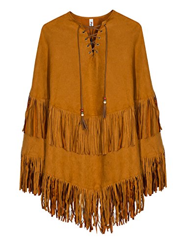Persun Women Khaki Suedette Lace Up Front Tasseled Poncho Cape Coat, Brown, onesize
