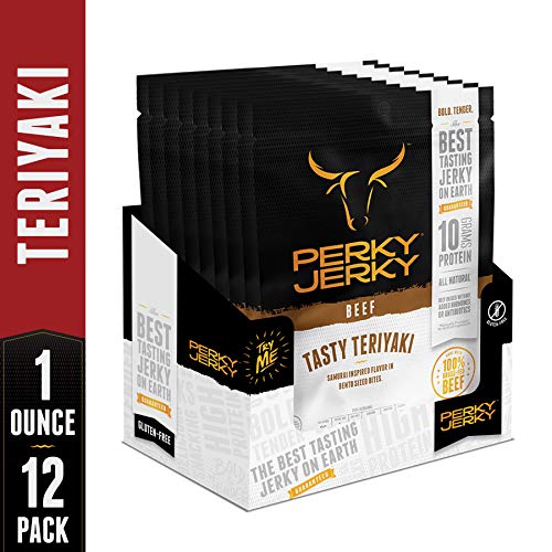 Perky Jerky 100% Grass-Fed Beef Jerky, Teriyaki, 1 oz. bag (Pack of 12)