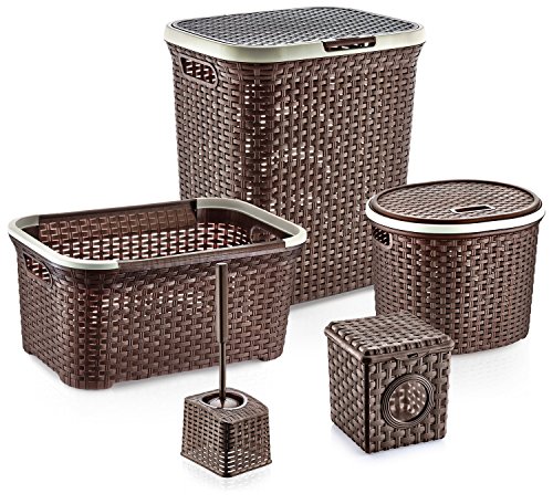 5 Piece Woven Design Bathroom Accessory Set - Luxury Bath Accessories Set, Hamper, Basket, Tissue Box, Toilet Brush and Holder, Wastebasket, Brown