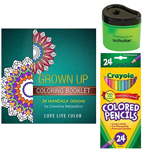 Adult Coloring Book Starter Gift Pack: Includes Crayola Colored Pencils, Love Live Color Mandala Grown Up Coloring Book and Prismacolor Scholar Sharpener (Bundle of 3) (24 Colored Pencils)
