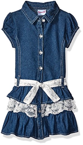 Nannette Girls' Short Sleeved Denim Dress with Lace Ruffles and Belt