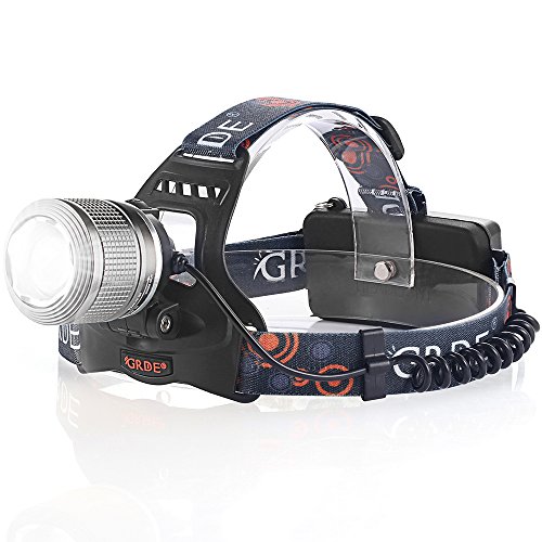 LED Headlight, GRDE 2000 Lumens Ultra-Bright Waterproof Headlamp 3 Modes Head Torch Spotlight Floodlight Flashlight with 2pcs Rechargeable 18650 Batteries for Camping Biking Working Hunting (Grey)