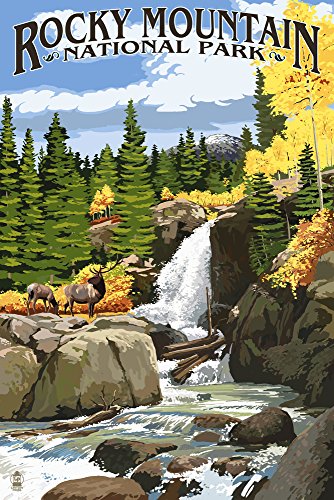 Rocky Mountain National Park, Colorado - Elk and Waterfall (36x54 Giclee Gallery Print, Wall Decor Travel Poster)