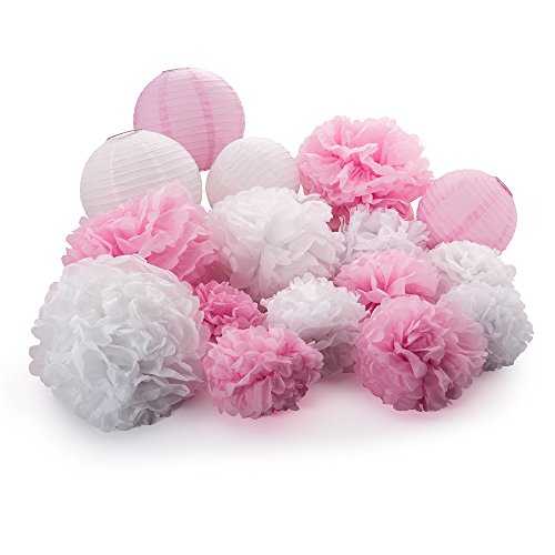 Active Arts 16 pcs Mixed 8" 10" 14" White/Pink Tissue POM POMS and LANTERNS Bundle Wedding Party Baby Girl Nursery Room Decoration