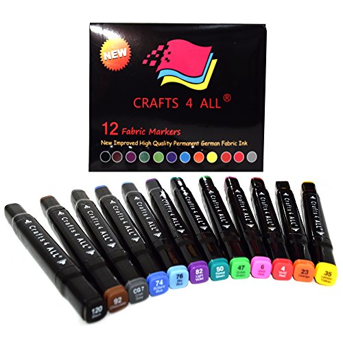 Fabric Markers Pens Permanent 12 Pack Dual Tip Minimal Bleed Rich Paint Color Pigment Fine Graffiti Fabric Pens by Crafts 4 ALL, Child Safe & Non Toxic
