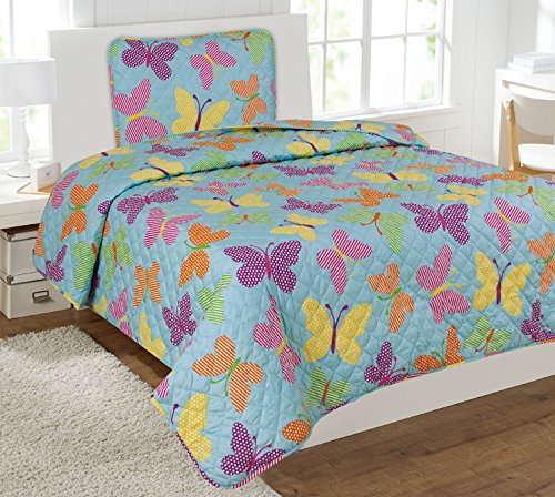 Awad Home Fashion 2 Piece Light Blue Quilt Bedspread Set Multicolor Sky Butterfly, Twin QS-02