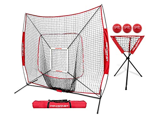 PowerNet DLX Combo 6 Piece Set for Baseball Softball (Red) | 7x7 Practice Net Bundle w/Strike Zone, Ball Caddy + 3 Weighted Training Balls | Team or Solo Training | Hitting & Throwing