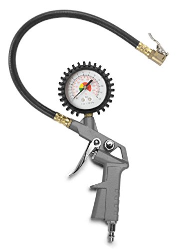 TYH Supplies Tire Air Pressure Gun Inflator Gauge with Chuck, PSI / BAR Dual Measurement up to 174 PSI, 1/4-inch Flexible Hose, Accessory Kit, Schrader to Presta Valve Adapter, 20 Valve Caps