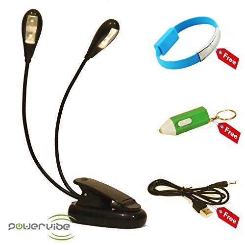 LED Book Light By Powervibe, Portable and Flexible Clip On Desk Reading Lamp, FREE Micro USB Bracelet, FREE Keyring Light, FREE USB Cord Included