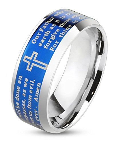 Artisan Owl Lord's Prayer Blue Beveled Edge IP Stainless Steel Ring with Cross