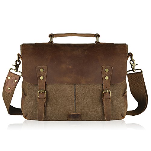 Smriti Vintage Real Leather Canvas Messenger Bag 14-Inch Laptop Briefcase - Coffee