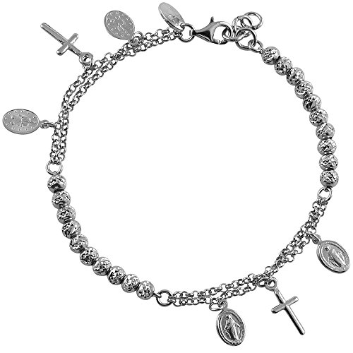 D Jewelry 925 Sterling Silver Virgin Mary Rosary Beads Bracelet Rhodium Plated Made in Italy, Adjustable 7" to 8"
