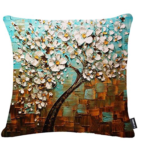 JINBEILE Cotton Linen Throw Pillow Cover Decorative 18 X 18 Inch Oil Painting White Flower Black Tree and Cushion Case Home Pillowcase