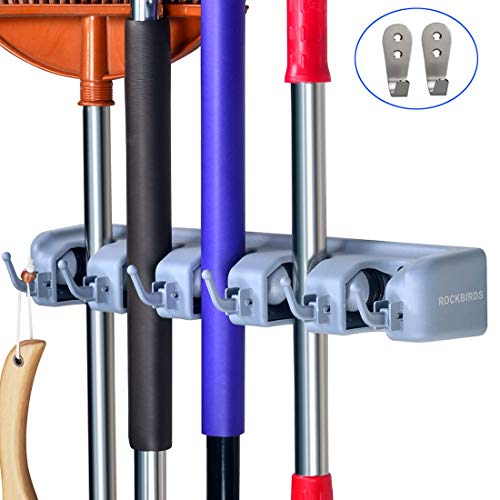 Mop and Broom Holder, RockBirds Broom Mop Holder Wall Mount with 5 Slots and 6 Hooks, Ideal Broom Hanger Solution for Kitchen Garage Warehouse(1 Pack +2 Extra Hooks)
