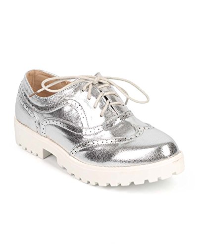 Liliana James-1 Distressed Metallic Wing Tip Lug Sole Spectator Oxford DF65 - Silver