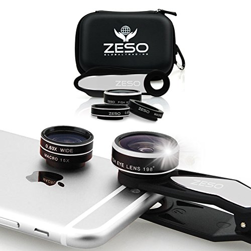 Cell Phone Camera Lens 3 in 1 Kit by Zeso | Professional Fisheye, Macro & Wide Angle Lenses | for iPhone, Samsung Galaxy, Android, iPads, Tablets | Universal Phone Clip & Hard Storage Case | 4 Colors