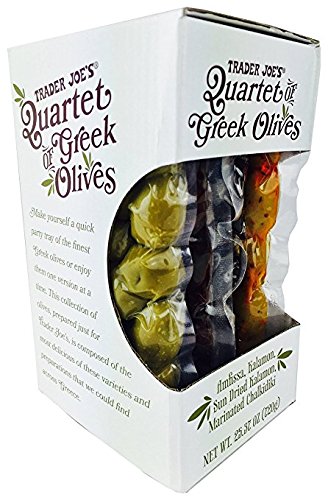 Trader Joe’s Quartet Of Greek Olives – Amfissa, Kalamon, Sun Dried Kalamon & Marinated Chalkidiki Olives, 6.36 Oz Each (4 Bags)