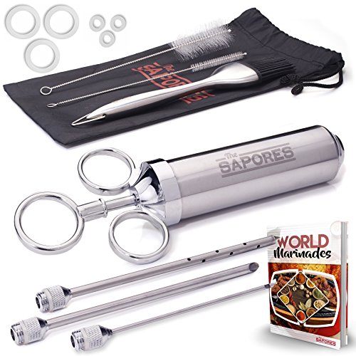 The Sapores Supreme Marinator Set - 2 Ounce 304 Stainless Steel Meat Injector, Baster Grill Brush and Cleaning Brushes - 100% Stainless Steel, BPA Free Food Grade Material