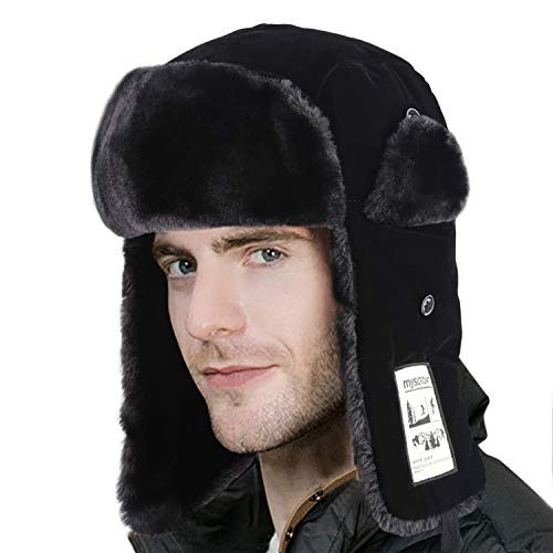 mysuntown Trapper Winter Hat, Ushanka Skiing Hunting Hats, Trooper Hat with Warm Ear Flap Fur Winderproof Bomber Hat for Men&Women, Black