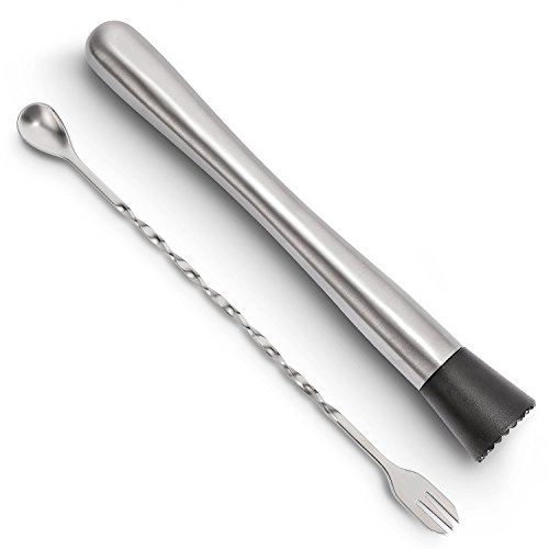 Hiware 10 Inch Stainless Steel Cocktail Muddler and Mixing Spoon Home Bar Tool Set - Create Delicious Mojitos and Other Fruit Based Drinks
