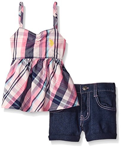 U.S. Polo Assn. Girls' 2 Piece Plaid Baby Doll Top and Denim Short In Dark Pink