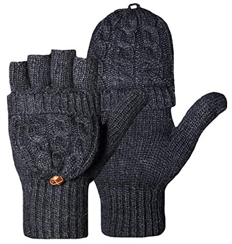 Korlon Winter Wool Knitted Convertible Fingerless Gloves with Mitten Cover Dark Gray One Size