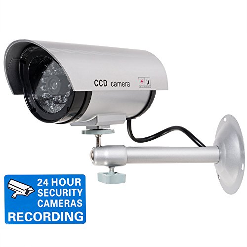 WALI Bullet Dummy Fake Surveillance Security CCTV Dome Camera Indoor Outdoor with 1 LED Light, Warning Security Alert Sticker Decals (TC-S1), Silver