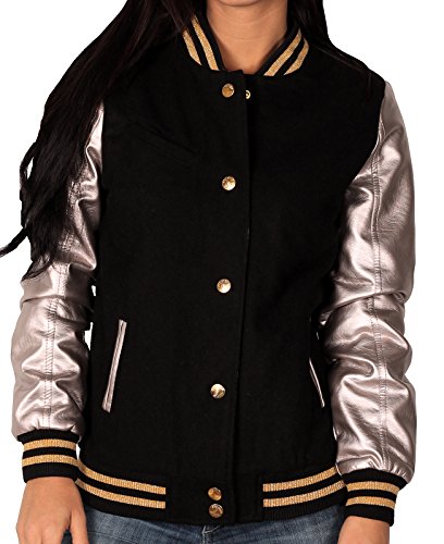 Sportier Junior Wool Blend Varsity Jacket with Faux Leather Sleeves, Black/Silver, Size Large