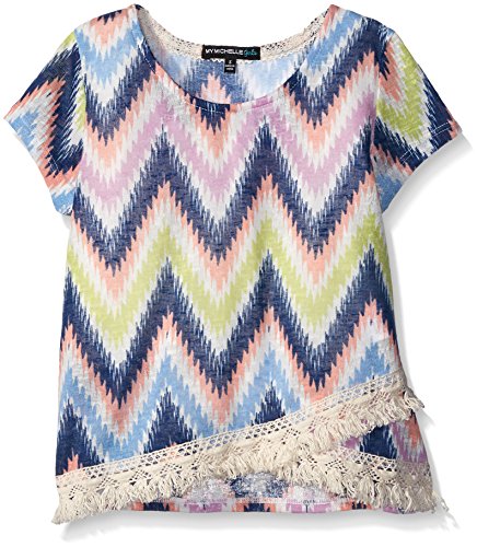 My Michelle Big Girls Printed Short Sleeve Top with Wrap Front And Fringe Hem, Multi, Large